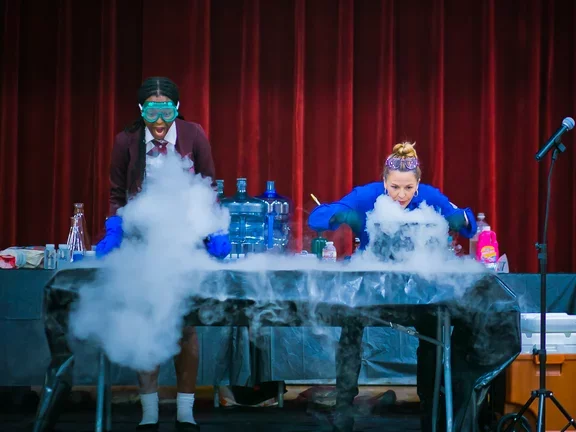 Students in grades 6-8 were able to experience and learn from Kate as she shared her journey as a woman in STEM and performed nine fun scientific experiments involving liquid nitrogen and dry ice supplied by Airgas, water, fire, and more! Some students were also able to get hands-on experience by volunteering to help Kate with her demos! After each experiment, students put their science skills to the test by guessing whether or not the materials used had a chemical or physical reaction.