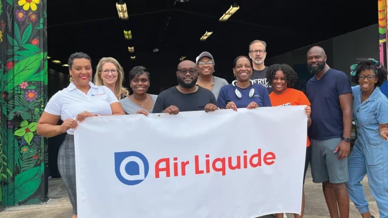 Nationally recognized artist Reginald C. Adams was commissioned to create the murals. The Air Liquide volunteers arrived at Adams’ studio where they were divided into four small groups. With paints and brushes in hand, they painted the canvases under the direction of Adams’ collaborating artists. Based in Houston, Adams is known for creating award-winning murals, sculptures and art installations in historic and underserved communities across the United States.